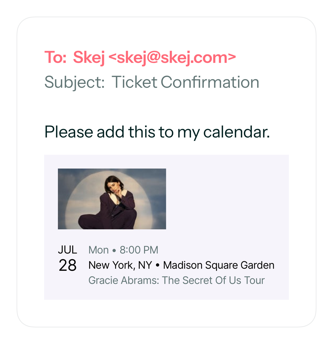 Paste a screenshot and ask Skej to add it to your calendar. Perfect for invitations, concerts, school events, and more.